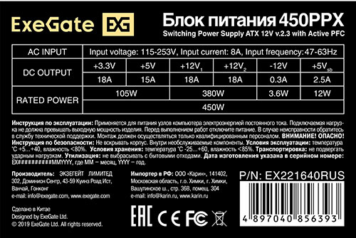 Блок питания ExeGate 450W 450PPX (EX221640RUS), отзывы (0) | Добавить отзыв |