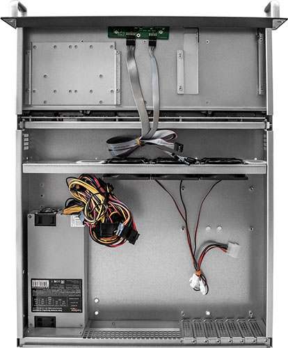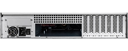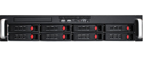 3 вентилятора типоразмера 80 мм размещены на перегородке. В корпусе реализованы 8 внешних отсеков для 2.5-дюймовых и 3.5-дюймовых накопителей SAS 6 Гбит/с и SATA I/II/III с поддержкой функции горячей замены. Особенностью устройства является возможность установки оптического привода форм-фактора Slim.