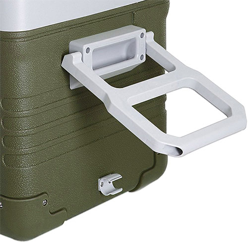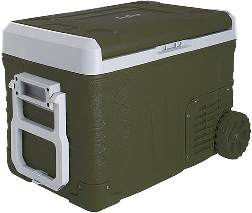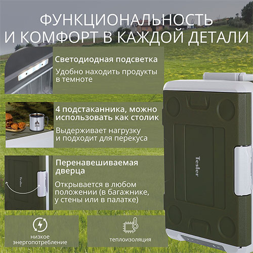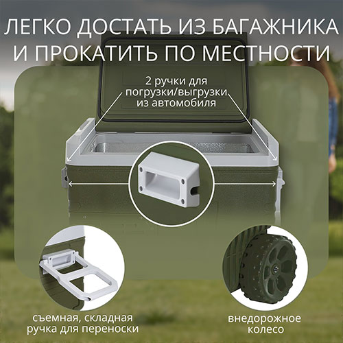 Для комфорта в использовании предусмотрены телескопическая ручка, крупные транспортировочные колёса, светодиодная подсветка и сливное отверстие для конденсата. Благодаря продуманной конструкции холодильник легко перемещается по неровным поверхностям. Возможность смены направления открывания крышки позволяет адаптировать его под любое пространство будь то багажник автомобиля, кемпинг или уголок в загородном доме.