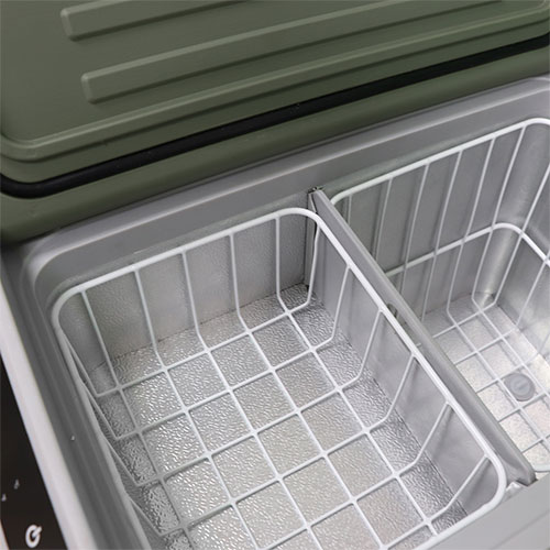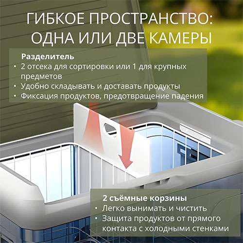Наличие двух съемных корзин и разделителя позволяют гибко трансформировать пространство внутри холодильника, удобно сортировать большое количество продуктов или, наоборот, перевозить крупные (арбуз, дыня), фиксировать их в вертикальном положении и защищать от падения и прямого соприкосновения с холодными стенками.