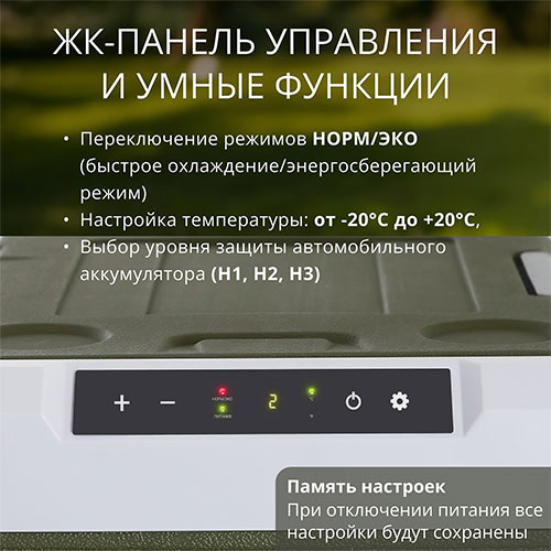 Автохолодильник оснащен современным компрессором с низким уровнем шума и энергопотребления, а также двумя режимами: экономичным и усиленным. Интеллектуальная система автоматически защищает аккумулятор автомобиля от глубокого разряда, что особенно важно при длительных поездках. Холодильник запоминает настройки даже после отключения от питания, что удобно при временном отключении.