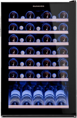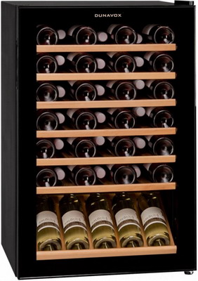 Компрессорный винный шкаф Dunavox DXFH-48.130 обладает средней вместимостью и способен разместить в себе до 48 бутылок. Располагаются они на выдвижных полках из массива бука. Внутреннее пространство шкафа имеет одну температурную зону с возможностью настраивать её в диапазоне от +5 °C до +18°C. Холодильник поддерживает влажность в диапазоне 60-80%, как в настоящем винном погребе.