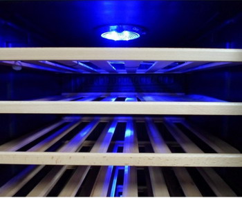 Лаконичный дизайн шкафа придаёт интерьеру современный вид. Дополнительно у данной модели предусмотрен демонстрационный режим, во время которого освещение не гаснет. Такая функция помогает демонстрировать винную коллекцию Вашим друзьям и близким. Используется освещение синего цвета, которое обеспечивает равномерную подсветку всех полок. (Освещение плавно включается при открывании дверцы, а через пару секунд после закрытия плавно гаснет.)
