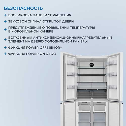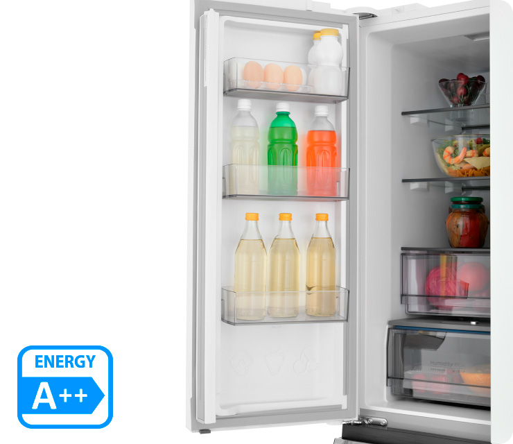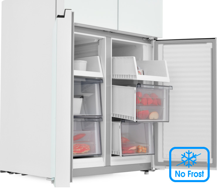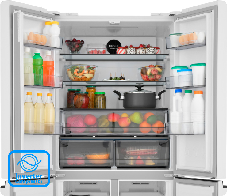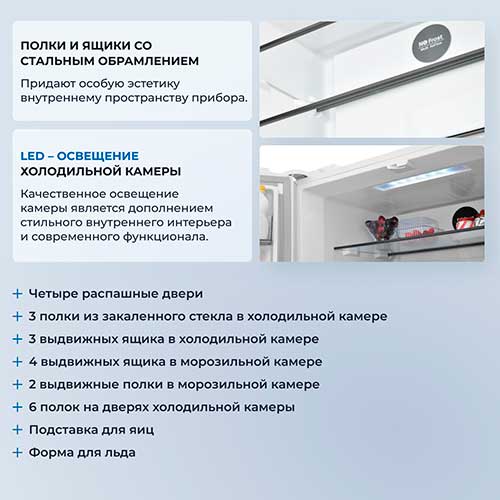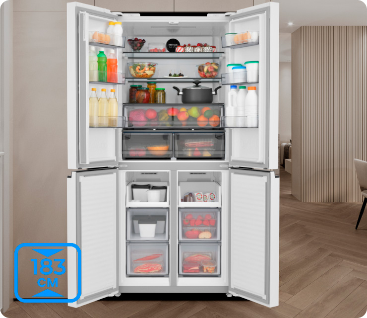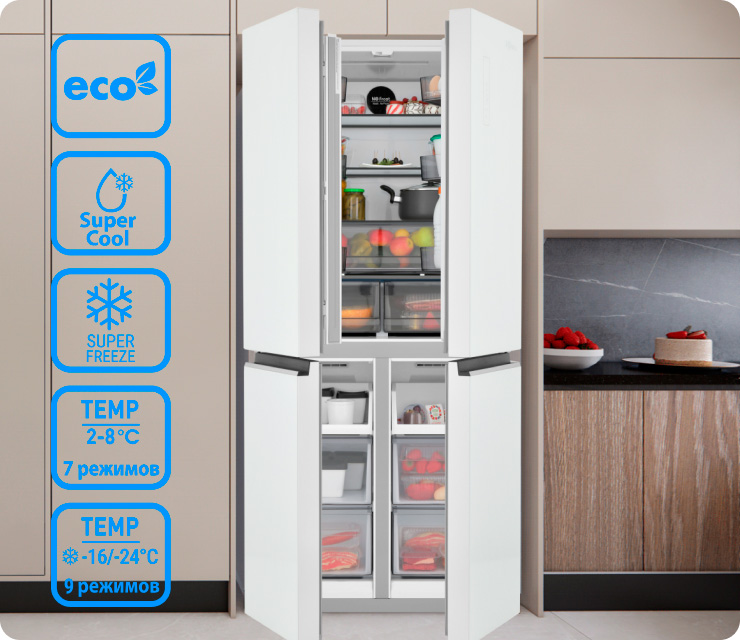 Четырехдверная распашная модель позволяет открывать отдельные внутренние зоны без дополнительных потерь температуры и электроэнергии