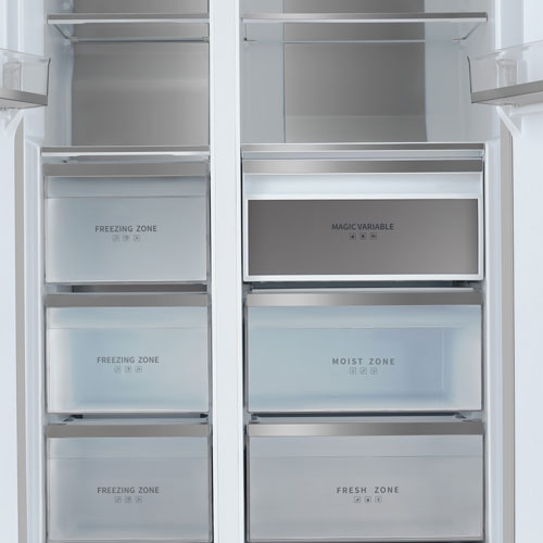 Большой полезный объем холодильника в 525 л обеспечивает простор для хранения продуктов разных видов и размеров. Холодильное отделение с полезным объемом 302 л оборудовано вместительными полками и дверными карманами, некоторые из которых вы можете убрать в случае необходимости. Отсек с повышенной влажностью и отделение с вариативной температурой помогут создать оптимальные условия для различных видов продуктов, сохраняя их свежесть и вкус.
