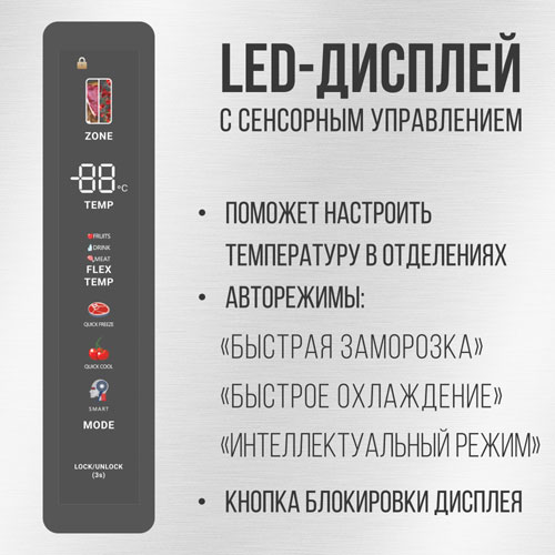 Цветной LED дисплей поможет настроить нужные параметры для каждой из камер по отдельности, либо активировать автоматические режимы. Температура холодильной камеры может быть установлена в диапазоне от 2°С до 8°С, температура морозильной - от -23 °С до -15°С. B случае необходимости панель управления можно заблокировать. Охладить большое количество только что купленных продуктов поможет функция «Быстрое охлаждение», при которой температура в холодильной камере устанавливается на 2°С.