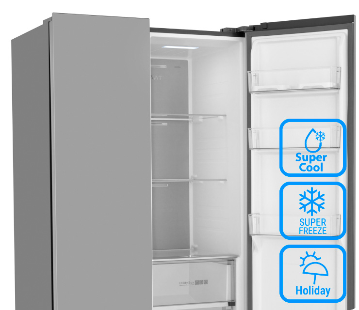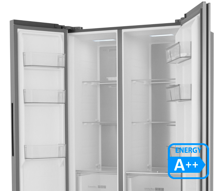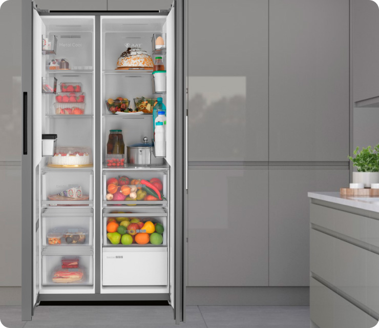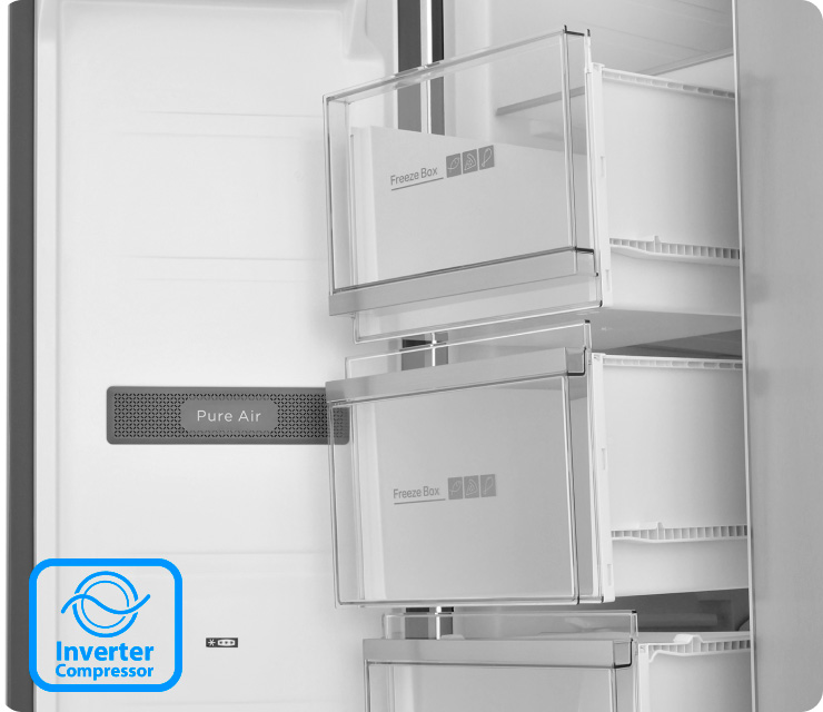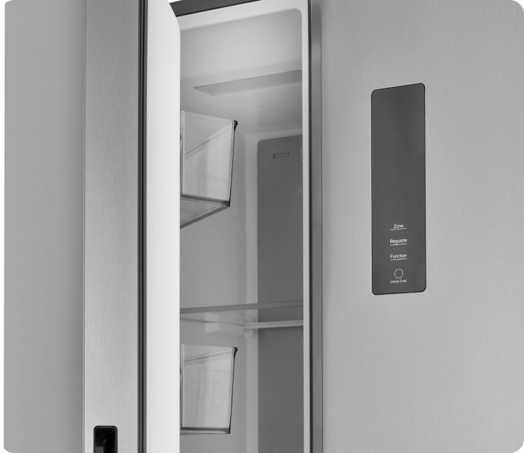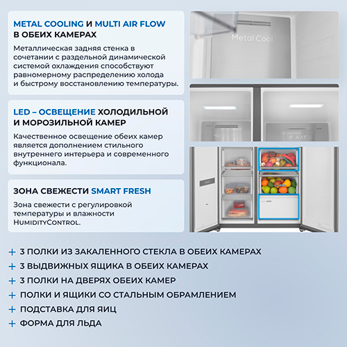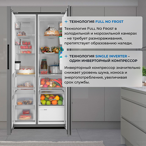 Параллельное боковое расположение холодильной и морозильных камер, распашные двери предоставляют удобный доступ ко всем полкам и выдвижным ящиком