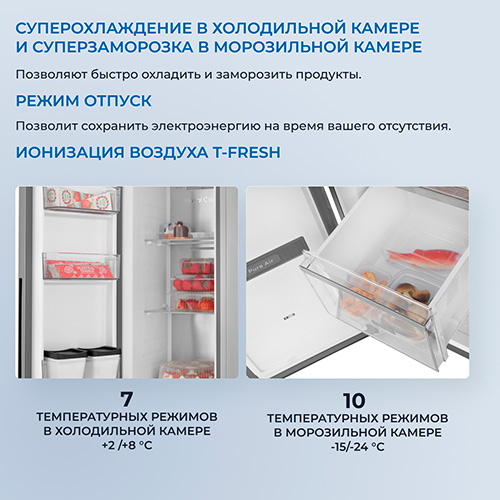 Технология ионизации воздуха T-FRESH: встроенный биополярный ионизатор вырабатывает положительно и отрицательно заряженные ионы, которые уничтожают бактерии и грибки, очищают воздух, продлевают сроки хранения продуктов, создают здоровый сбалансированный микроклимат в холодильной камере
