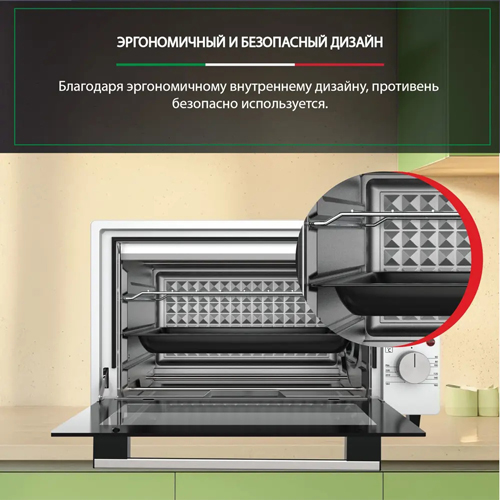 Одна из основных особенностей данной мини-печи — удобный механический таймер на 90 минут, который позволяет устанавливать время приготовления с точностью. Таким образом, вы можете заниматься другими делами, не беспокоясь о том, что пища может пригореть. Дверца из прочного стекла обеспечивает легкое наблюдение за процессом приготовления. Одностворчатая конструкция минимизирует потери тепла, что делает использование устройства комфортным и экономичным.