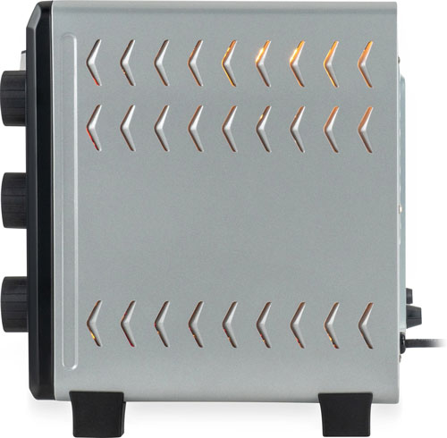Прибор по габаритным размерам больше напоминает микроволновую печь, чем духовку. Он помещается на стандартную столешницу и благодаря этому превосходно впишется в кухню любого размера. Его корпус окрашен в стильный металлик с добавлением чёрного – такой дизайн универсален и подходит под любой интерьер.