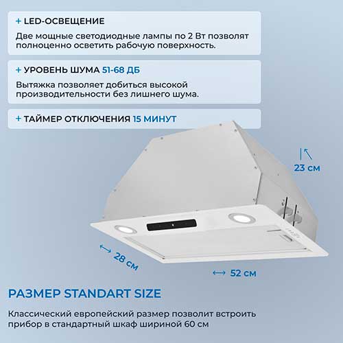 5,00 | | Преимущества: | Поставил эту вытяжку в белом цвете на новую кухню, и она идеально вписалась. Управление сенсором оказалось удобным, реагирует быстро, не нужно сильно давить. Мощности хватает, чтобы за пару минут убрать запахи. | | Недостатки: | Отсутствуют как таковые. | | Комментарий: | Устанавливал сам, крепление действительно оказалось простым. В общем, доволен, кухню держит в чистоте и смотрится стильно. |