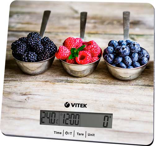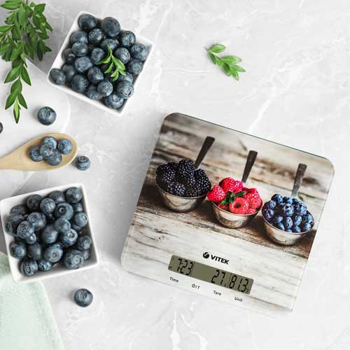 Кухонные весы VITEK VT-2429 – это не просто самый подходящий прибор для того, чтобы что-нибудь взвесить. Это также отличный способ, узнать который час и какая температура в помещении. Весы оборудованы большим дисплеем с крупными цифрами, который при необходимости покажет вам вес не только в граммах, также в фунтах и унциях. А еще – не превышен ли предел взвешивания, и не пора ли сменить элементы питания. Дисплей скрыт под ударопрочным стеклом, покрывающим всю рабочую поверхность весов, что делает уход за ними очень легким. Стильная и вкусная фотография свежих ягод, которой декорированы весы VITEK VT-2429 превращает их в модный аксессуар, который без сомнения будет отлично смотреться на вашей кухне.