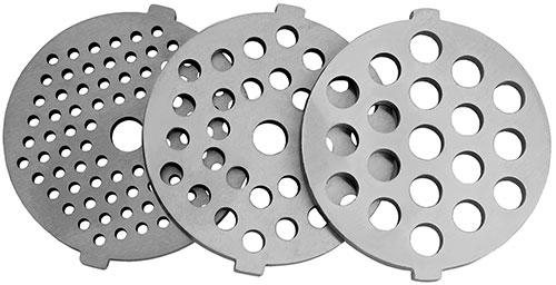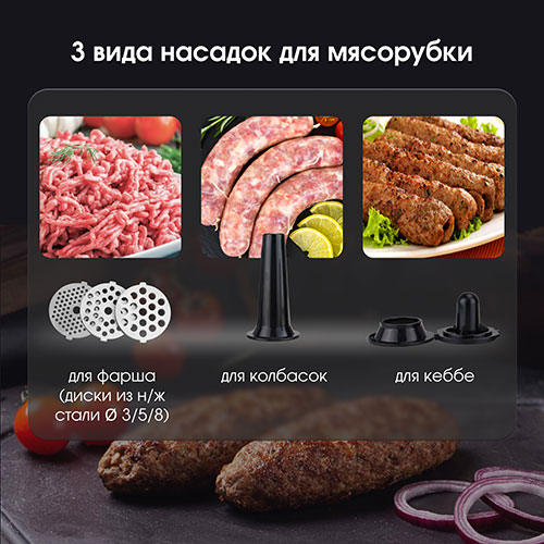 3 дисковые насадки с отверстиями ∅ 3/5/8 мм для мелкой, средней и крупной рубки, а также насадки для приготовления колбасных изделий и кеббе