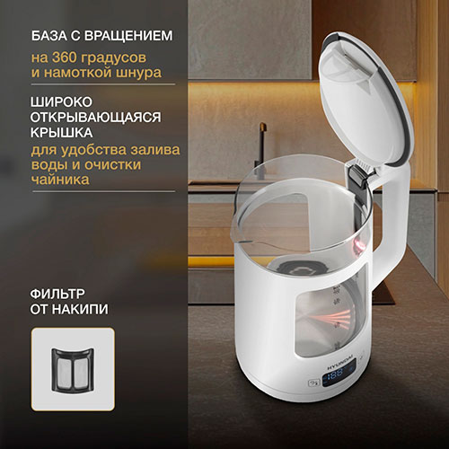 Дисплей, кнопка открытия крышки, подставка 360, фильтр от накипи