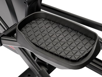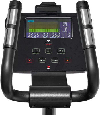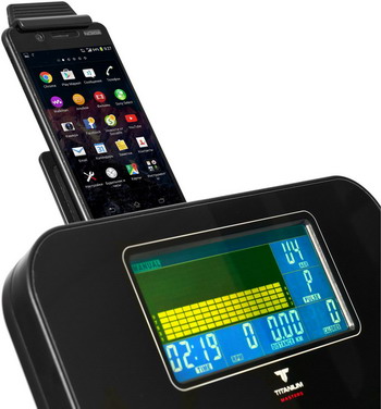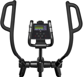 Консоль эллиптического тренажера представлена цветным LCD-дисплеем диагональю 5,5 дюйма (14 см) с профилем тренировочных программ. Регулировать нагрузку можно в диапазоне от самой легкой до наиболее тяжелой, к которой готовы только профессиональные спортсмены. Всего можно использовать 24 уровня, в Ваттах диапазон нагрузки составляет от 10 до 350. 12 предустановленных программ направлены на тренировку скоростных качеств, выносливости, укрепления сердечно-сосудистой системы и похудания. Помимо этого, можно воспользоваться самостоятельно регулируемым ручным режимом, а также создать 4 собственные программы. Для тренировок с контролем пульса существуют 4 пульсозависимые программы с предустановленными значениями 55%, 75%, 90% и 100% от максимального пульса (точная цифра частоты сердечного ритма определяется исходя из возраста пользователя). Безусловно, полноценная пульсозависимая тренировка потребует наличия телеметрии - для этого в консоль тренажера встроен приемник частоты сердечного пульса (для полноценной работы потребуется нагрудный передатчик пульса Titanium Masters HR Transmitter или совместимый). Ватт-программа позволяет зафиксировать необходимый уровень нагрузки - он останется постоянным вне зависимости от скорости вращения педалей. Небольшой, но востребованной опцией является подставка под смартфон - просмотр видео, соцсети или простой серф в интернете поможет скрасить рутинность тренировок. Тренажер перемещается за счет транспортировочных роликов, а выровнять его положение на поверхности можно при помощи компенсаторов неровностей пола.