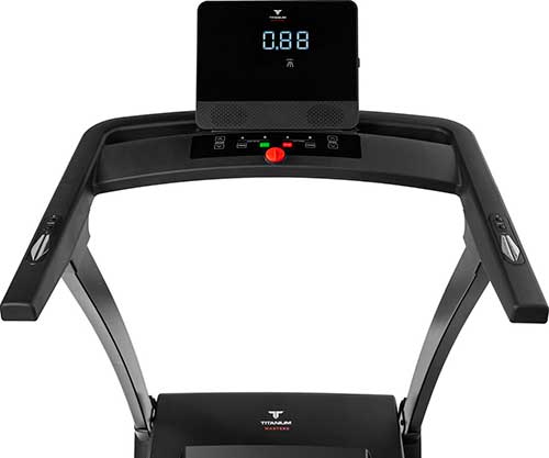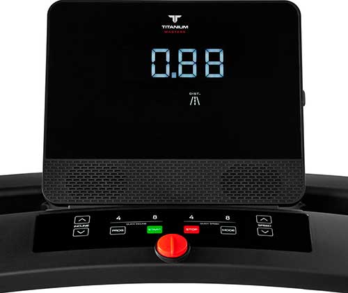Тренировочный компьютер представлен голубым LCD-дисплеем диагональю 5 дюймов (12,7 см) c сенсорными клавишами. На экран одновременно выводятся все основные параметры тренировки - время, скорость, дистанция, угол наклона, потраченные калории и пульс. 15 предустановленных программ и 3 программы обратного отсчета (время, дистанция, калории) позволяют выбрать оптимальный для пользователя тренировочный режим. Для считывания показаний пульса в поручни дорожки вмонтированы контактные сенсорные датчики. Благодаря "быстрым клавишам" управления можно отрегулировать скорость либо угол наклона, не снимая рук с поручней.