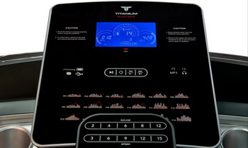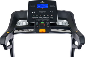 Тренировочный компьютер представлен голубым многофункциональным дисплеем диагональю 7 дюймов (17,8 см.). Встроенные программы ориентированы на любые возможные задачи - снижение веса, тренировку выносливости или скоростных качеств. Помимо предустановленных программ, можно воспользоваться самостоятельно регулируемым ручным режимом, а также создать собственную программу в одном из 3-х пользовательских режимов. 3 пульсозависимые программы с предустановленными значениями 60%, 75%, 90% отвечают за тренировку тех пользователей, которым важно контролировать показатели частоты сердечного ритма. Для точного определения пульса и просто комфортной тренировки в компьютер встроен высокоточный беспроводной телеметрический приемник. Разнообразить тренировку поможет мультимедийная составляющая - в консоль дорожки установлены колонки мощностью 3 ватта, а носителями аудио файлов выступают MP3-плеер, смартфон, USB-флешка или SD карта. Через USB вход также можно зарядить мобильный телефон.