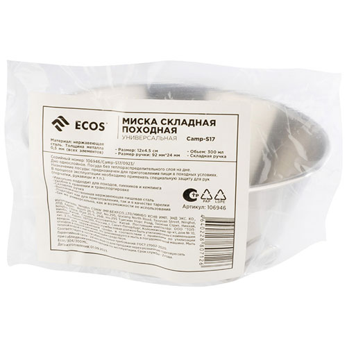 Миска складная походная Ecos Camp-S17, 300 мл, нержавеющая сталь (106946) В наличии. На складе партнера |