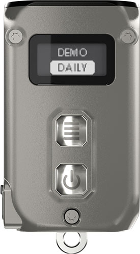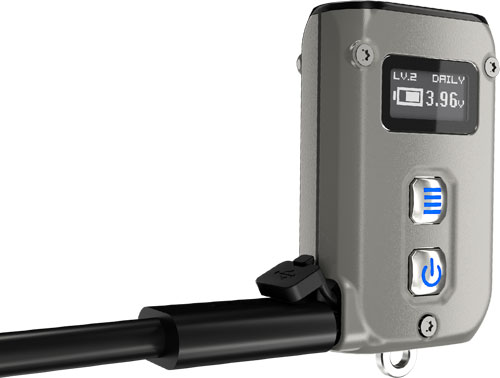 Корпус наключника выполнен из высокопрочной нержавеющей стали. Благодаря титановому покрытию PVD (физическое осаждение из паровой фазы) версия из нержавеющей стали отличается уникальной утонченной элегантностью. Многофункциональный OLED-дисплей всегда готов показать текущее состояние фонарика: уровень заряда батареи и напряжение, уровень яркости, текущий пользовательский режим и оставшееся время работы.