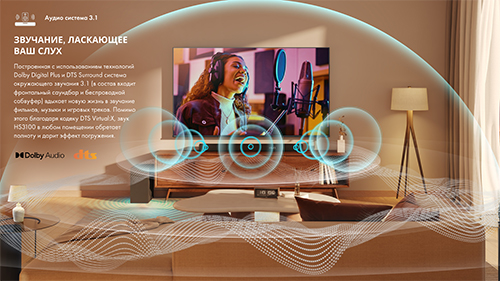 Аудио система 3.1. Построенная с использованием технологий Dolby Digital Plus и DTS Surround система окружающего звучания 3.1 (в состав входит фронтальный саундбар и беспроводной сабвуфер) вдыхает новую жизнь в звучание фильмов, музыки и игровых треков. Помимо этого благодаря кодеку DTS Virtual:X, звук HS3100 в любом помещении обретает полноту и дарит эффект погружения.