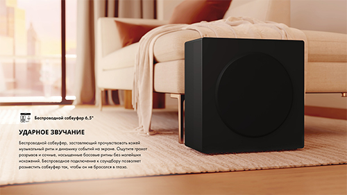 Беспроводной сабвуфер 6,5 , заставляющий прочувствовать кожей музыкальный ритм и динамику событий на экране. Ощутите грохот разрывов и сочные, насыщенные басовые ритмы без малейших искажений. Беспроводное подключение к саундбару позволяет разместить сабвуфер так, чтобы он не бросался в глаза.