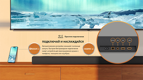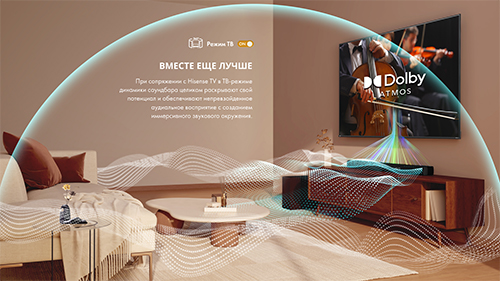 При сопряжении с Hisense TV в ТВ-режиме, динамики саундбара целиком раскрывают свой потенциал и обеспечивают непревзойденное аудиальное восприятие с созданием иммерсивного звукового окружения.