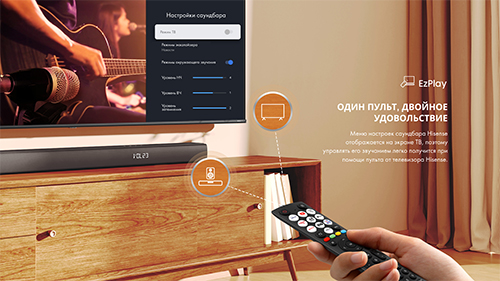 Меню настроек саундбара отображается на экране ТВ, поэтому управлять звучанием саундбара Hisense можно также легко при помощи пульта от телевизора Hisense.
