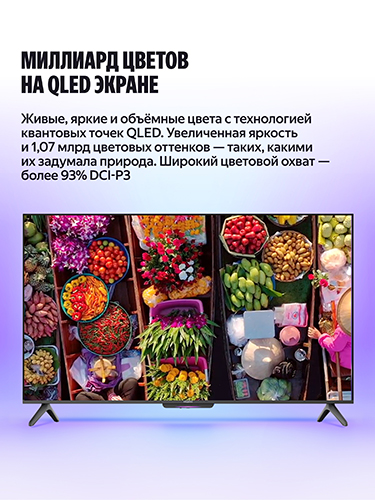 ⁶ Доступно при подключении умных устройств, работающих с Алисой. AI TV — Artificial Intelligence Television. Телевизор с использованием технологий искусственного интеллекта. QLED — Quantum dot Light Emission Diode. Технология изготовления подсветки экрана телевизора с использованием светодиодов и квантовых точек.