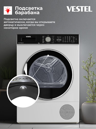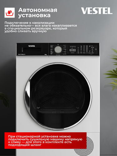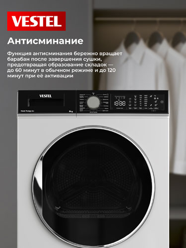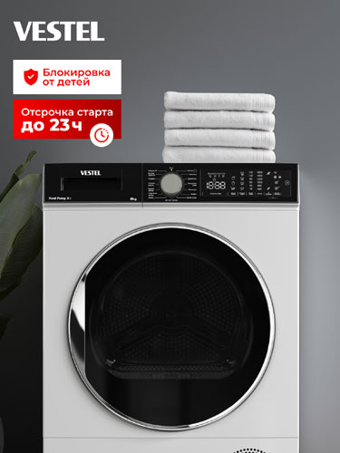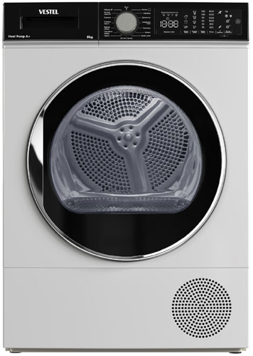 Если в начале цикла вы вспомнили о забытой футболке или паре носков, выручит функция дозагрузки белья — просто поставьте программу на паузу и добавьте вещи. Модель рассчитана на автономную установку, поэтому её легко разместить там, где удобно: в прачечной, гардеробной или нише рядом со стиральной машиной. Интуитивная панель управления, понятные подписи режимов и наглядные индикаторы помогают быстро выбрать нужные настройки, а тепловой насос делает каждую сушку ощутимо экономичнее по сравнению с классическими решениями. Vestel — это тихая, деликатная и энергоэффективная сушка, которая бережно заботится о гардеробе всей семьи день за днём.