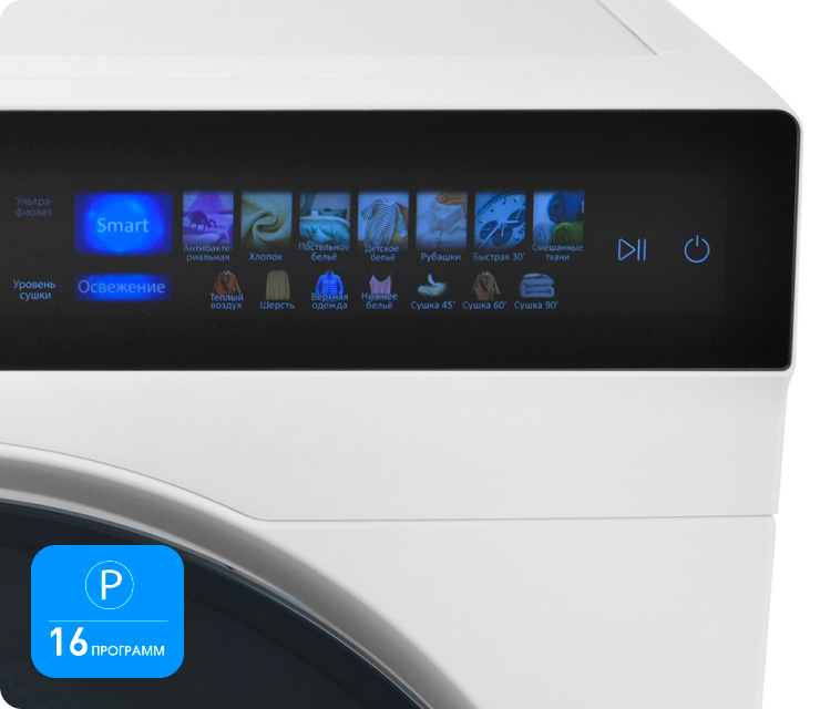 16 программ: Smart/Антибактериальная/Хлопок/Постельное белье/Детское белье/Рубашки/Быстрая 30'/Смешанные ткани/Освежение/Теплый воздух/Шерсть/Верхняя одежда/Нижнее белье/Сушка 45'/Сушка 60'/Сушка 90'