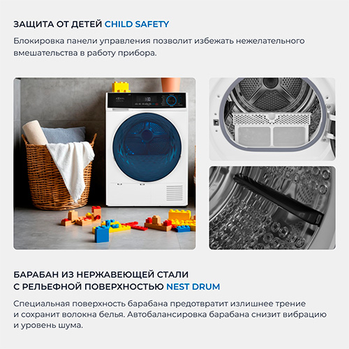 Реверсивное вращение двигателя обеспечивает более быстрое и качественное просушивание белья