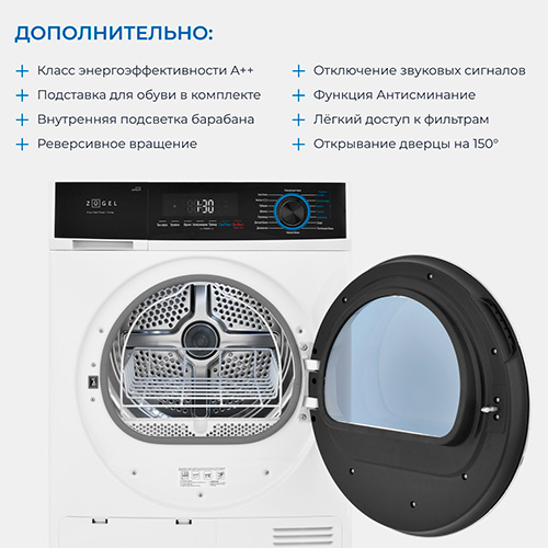 Открывание дверцы на 150° облегчает загрузку и извлечение белья из барабана