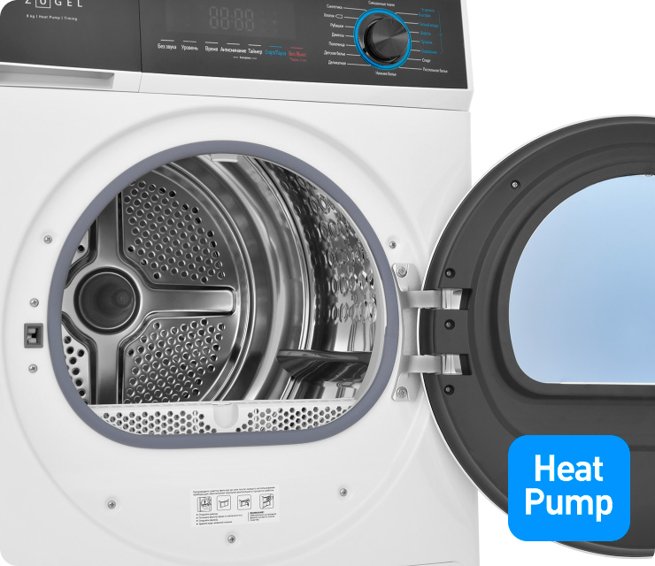 Тепловой насос Heat Pump – инновационная технология, которая обеспечивает эффективную и бережную сушку на невысоких температурах, исключает усадку и повреждение белья, подходит для деликатных тканей, значительно экономит электроэнергию
