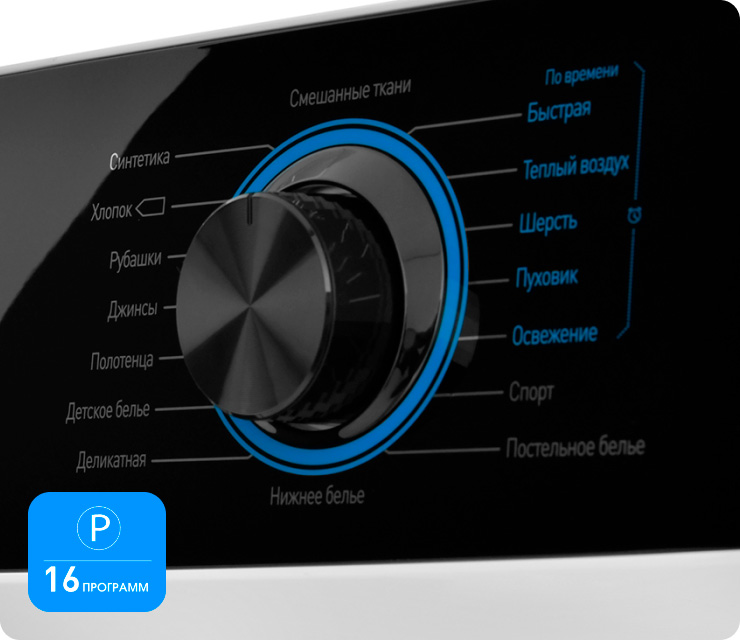 16 программ: Синтетика/Хлопок/Рубашки/Джинсы/Полотенца/Детское белье/Деликатная/Смешанные ткани/Быстрая/Теплый воздух/Шерсть/Пуховик/Освежение/Спорт/Постельное белье/Нижнее белье